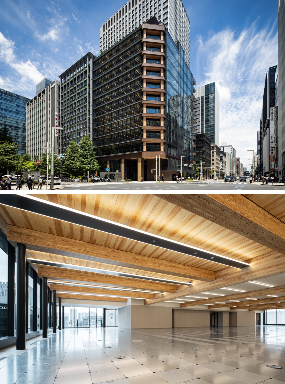 木造と鉄骨造のハイブリッド構造によるオフィスビルです。主要構造部の天井や梁に使用した木材を積極的に内装デザインにも活用し、木に囲まれた快適な執務空間を提供しています。